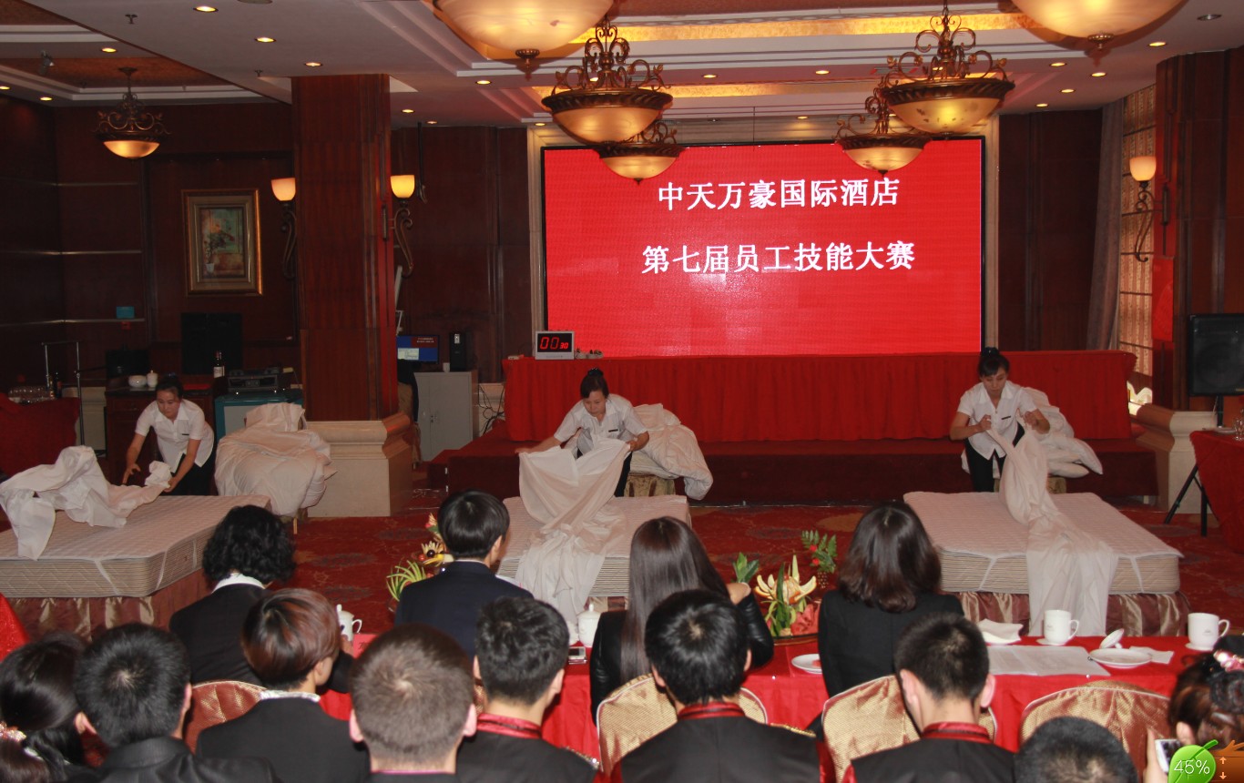 中天萬豪國際酒店一年一度的技能大賽,是檢驗酒店員工業(yè)務技能水平的一個平臺,是擇優(yōu)選拔技能高手的一次練兵,也是深入貫徹規(guī)范服務,全面提高員工業(yè)務技術水平及綜合技能的一項重要舉措。11月21日下午,中天萬豪國際酒店第七屆員工技能大賽在碩果累累的深秋拉開了帷幕,由餐飲部、客房部、前廳部、娛樂部、財務部、保安部和工程部選派的85名選手參加了比賽和技能演示。酒店總經(jīng)理于洪波、副總經(jīng)理高子洋、職業(yè)技術學校董娜老師、酒店副總經(jīng)理高子洋出席了比賽現(xiàn)場,并擔任評委,酒店副總高子洋在賽前致辭。
