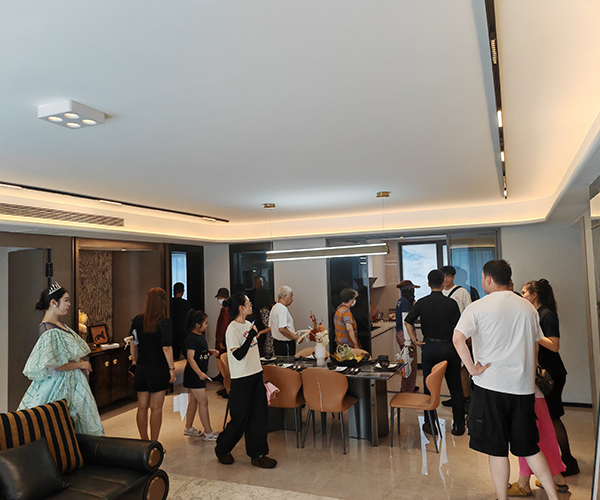 儀式現(xiàn)場(chǎng),熱情高漲的客戶早已匯聚于這座流光溢彩的東大門前。以名貴理石精工筑就、星空頂熠熠生輝、水幕墻靈動(dòng)瀉玉、噴泉水系恭迎貴賓的“星幕尊邸門”,其本身即是歸家尊崇儀式的開(kāi)篇序章,成為令人矚目的視覺(jué)地標(biāo)。人群中,既有開(kāi)盤即購(gòu)房的業(yè)主,滿懷憧憬前來(lái)借鑒設(shè)計(jì)靈感,為未來(lái)愛(ài)家描繪藍(lán)圖;亦有眾多意向濃厚的準(zhǔn)業(yè)主,翹首以盼親身體驗(yàn)升級(jí)品質(zhì),為理想生活尋覓最契合的空間載體。