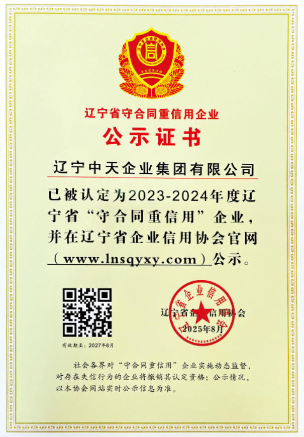 近日,中天集團(tuán)憑借卓越的商業(yè)信譽和嚴(yán)謹(jǐn)?shù)穆募s能力,被遼寧省企業(yè)信用協(xié)會認(rèn)定為2023-2024年度遼寧省“守合同重信用”企業(yè)和信用等級5A級企業(yè),這是集團(tuán)自2005年以來連續(xù)20年獲此殊榮。這一榮譽不僅是對集團(tuán)長期以來堅持誠信經(jīng)營的高度認(rèn)可,更是對企業(yè)在打造品牌、服務(wù)社會方面不懈追求的充分肯定。